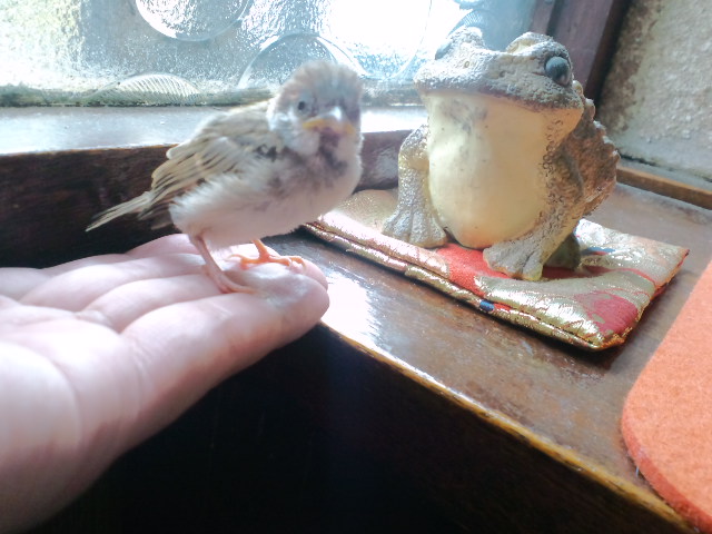 昨日会社で朝、生産課の課長が雀の雛を拾った。