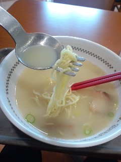 ちなみに、伝統のフォークスプーン、麺を啜ると同時にスープも同時に口に運ばれる・・・との触れ込みは間違っていると思う。これだと麺を啜る時に脇からスープがボチャボチャ逃げて行くのだ・・・